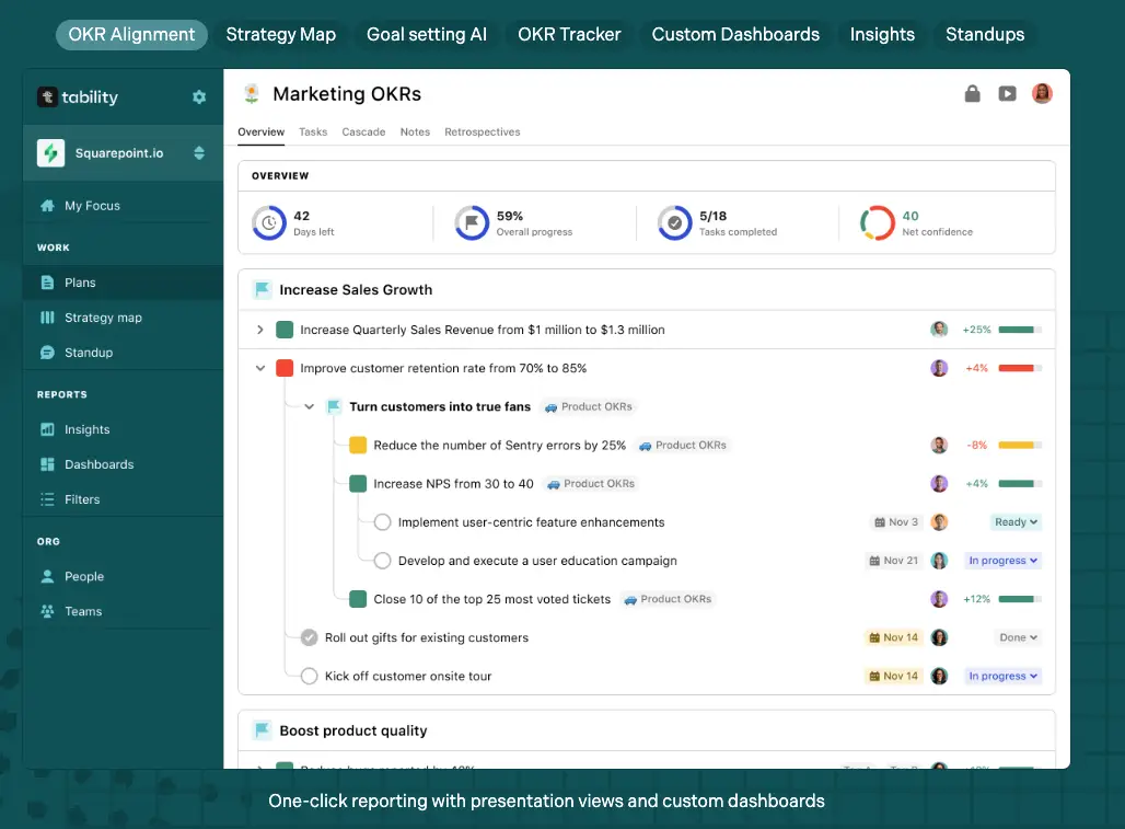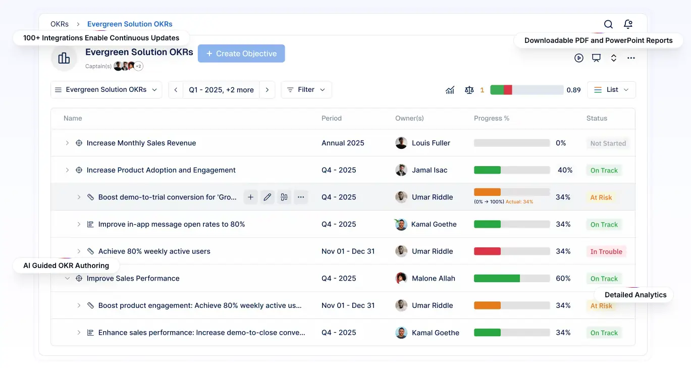 An AI-driven platform that brings every aspect of your team’s strategy execution under one roof-built on world-class OKR software